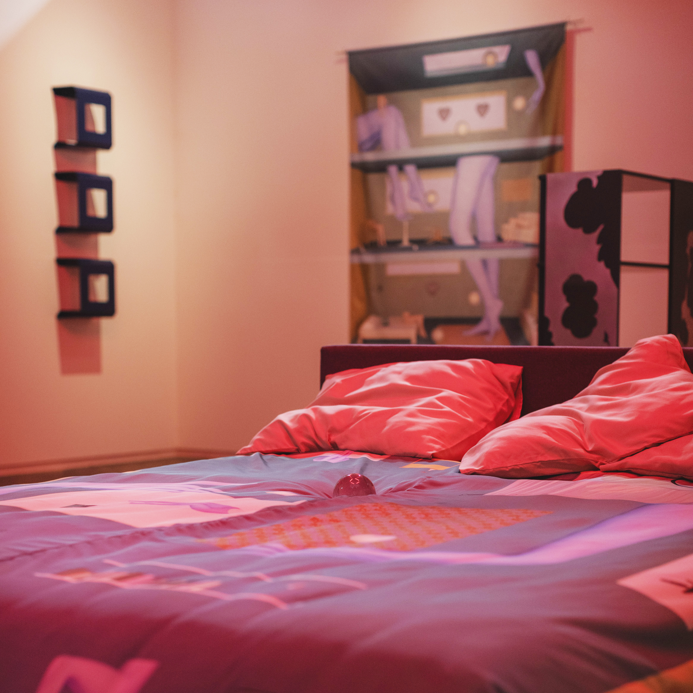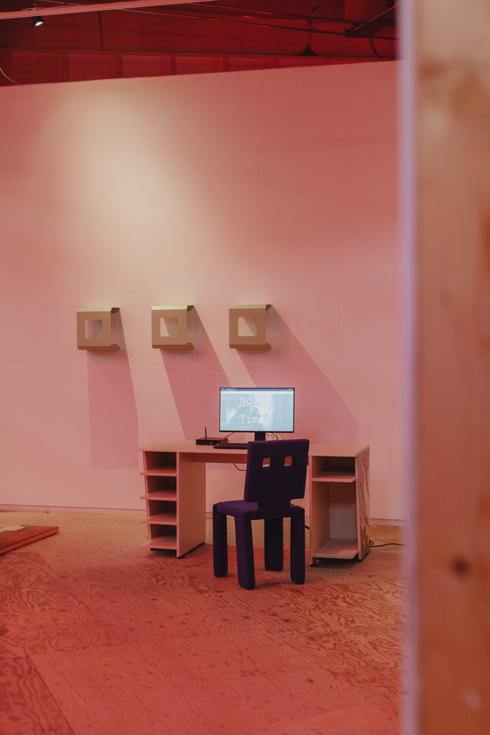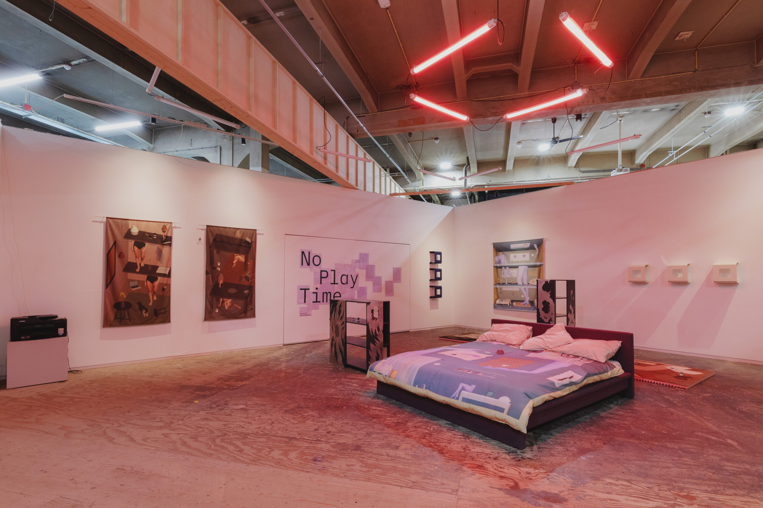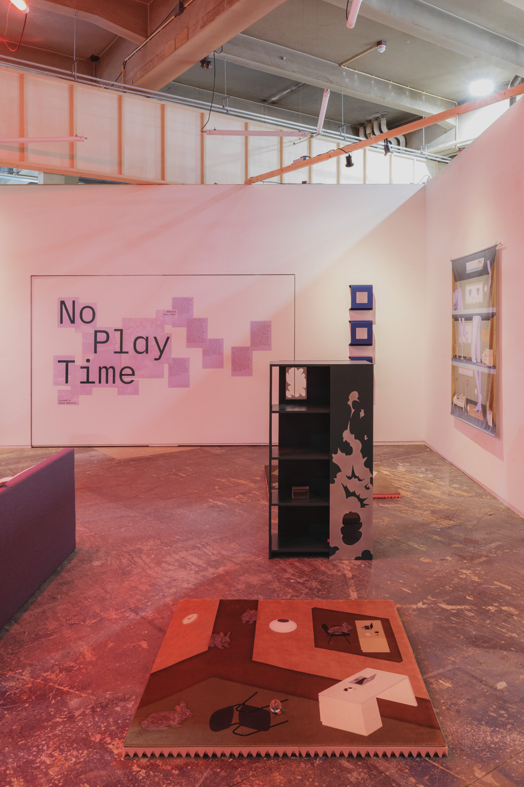 The exhibition “No Play Time” presents a unique dialogue between the soft, intimate textiles of artist Hala Tawil and the striking, conceptual furniture designs of GROOVIDO. Together, their works create a stylized teenage bedroom that invites visitors to explore the intersection of personal memory, identity, and material culture.